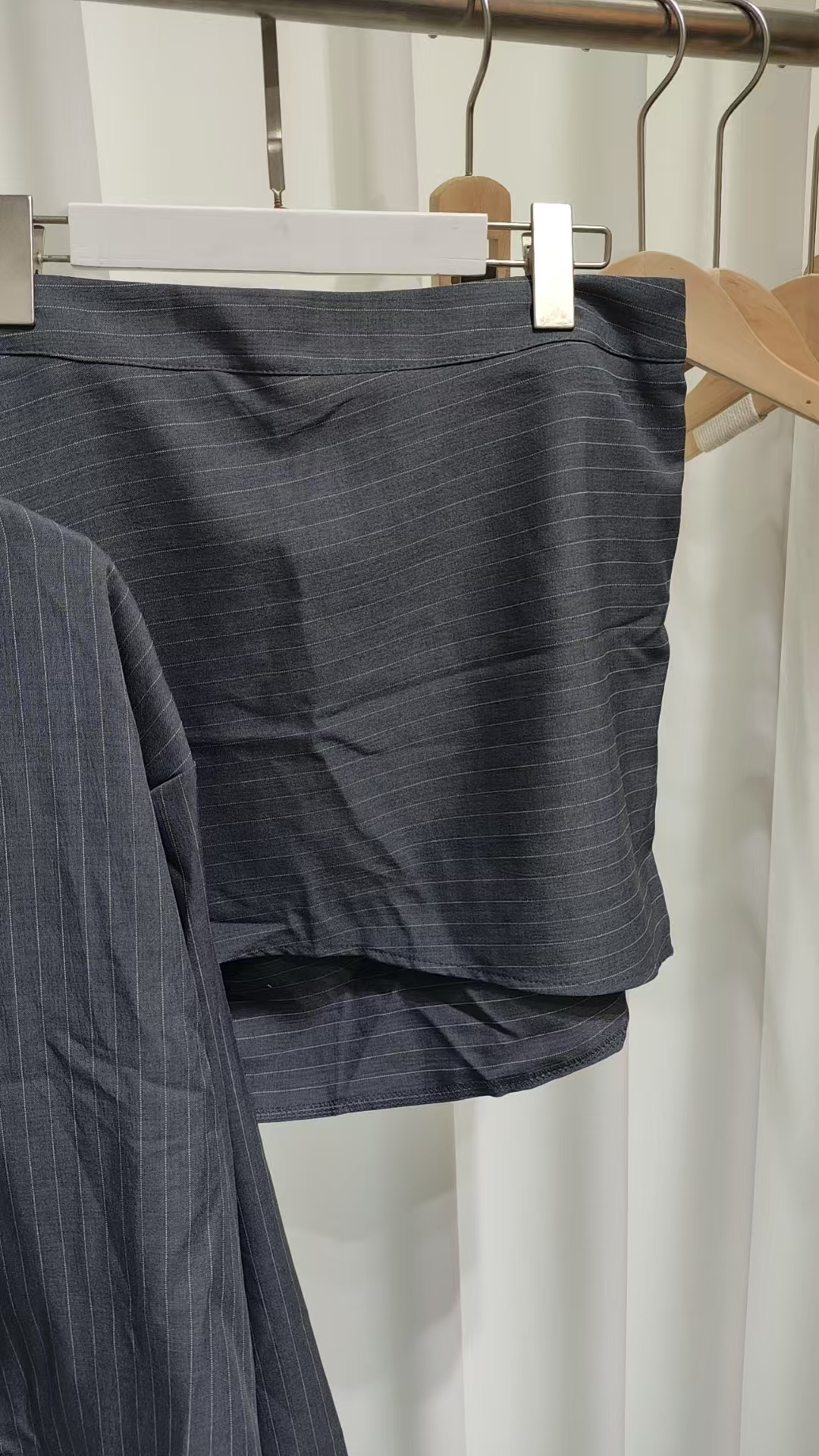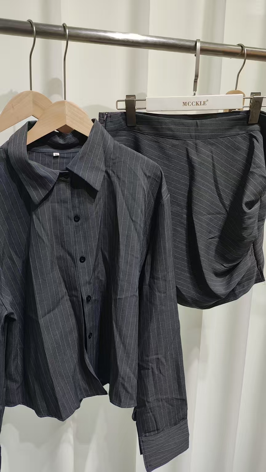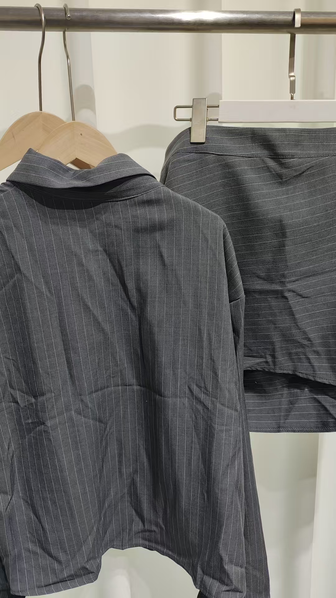 Absolutely in love with this grey pinstripe set! The combination of the long - sleeve shirt and the mini skirt is so chic and modern. The pinstripes add a sophisticated touch, making it suitable for both office days and a night out. The way the shirt is styled with the skirt gives a flattering silhouette that hugs my curves just right. It's a definite wardrobe staple!