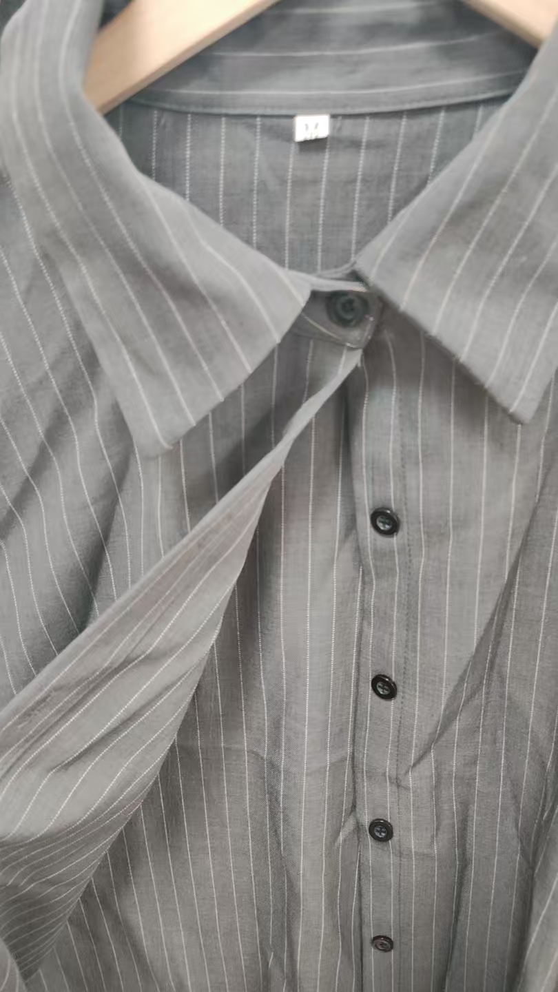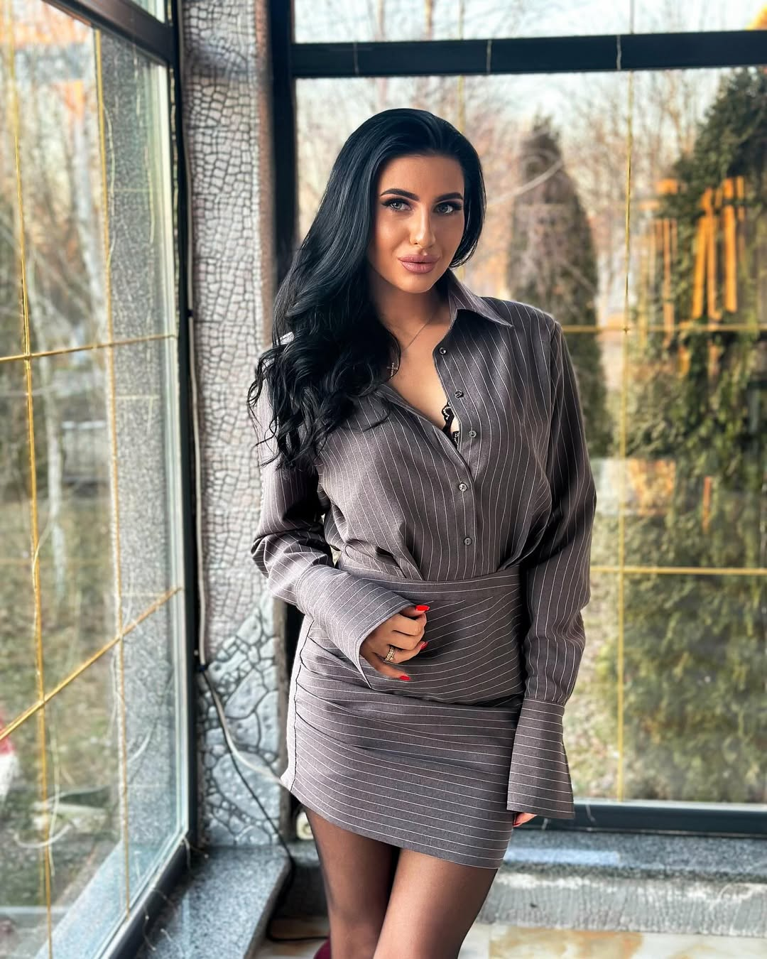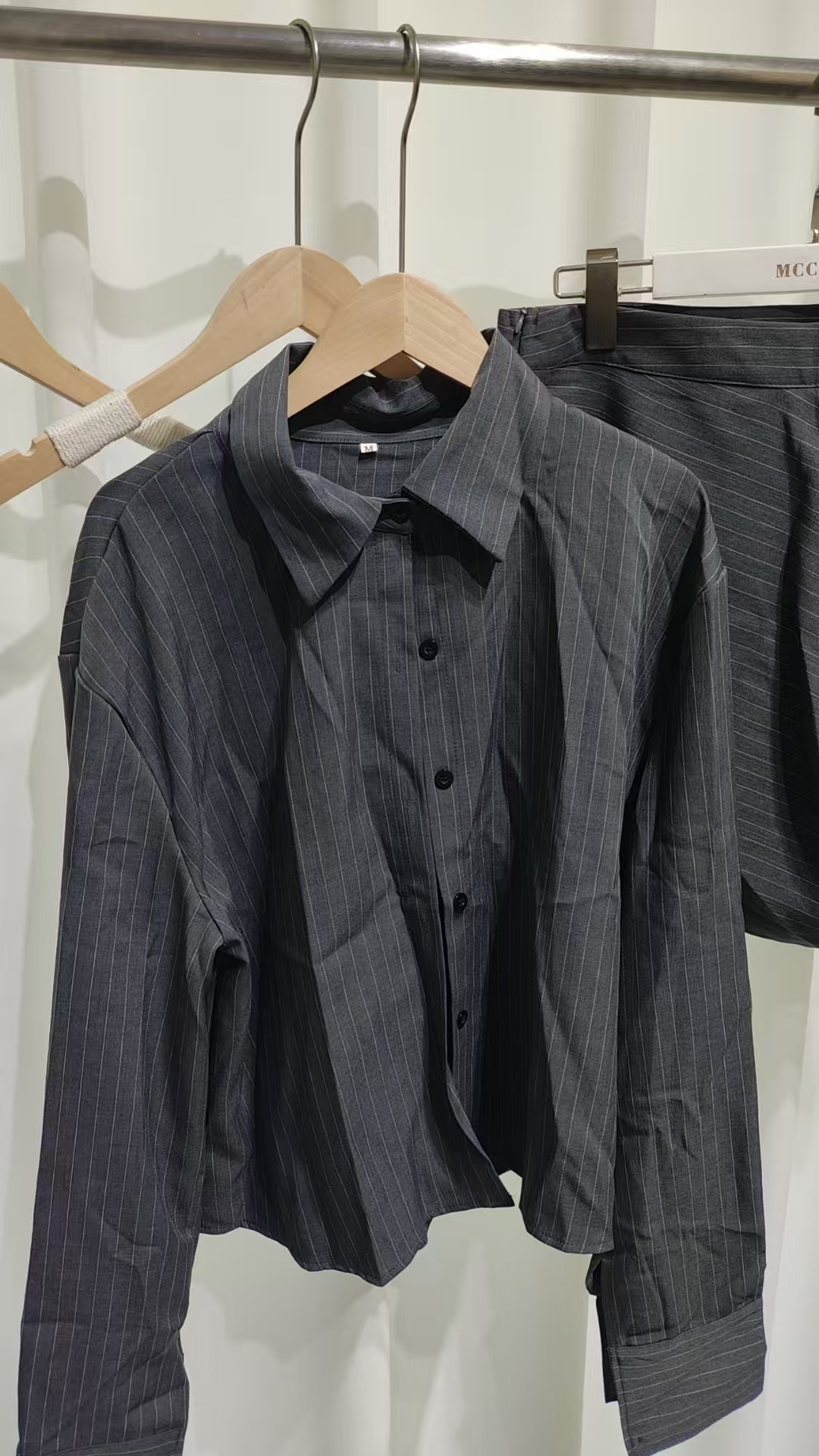 Absolutely in love with this grey pinstripe set! The combination of the long - sleeve shirt and the mini skirt is so chic and modern. The pinstripes add a sophisticated touch, making it suitable for both office days and a night out. The way the shirt is styled with the skirt gives a flattering silhouette that hugs my curves just right. It's a definite wardrobe staple!